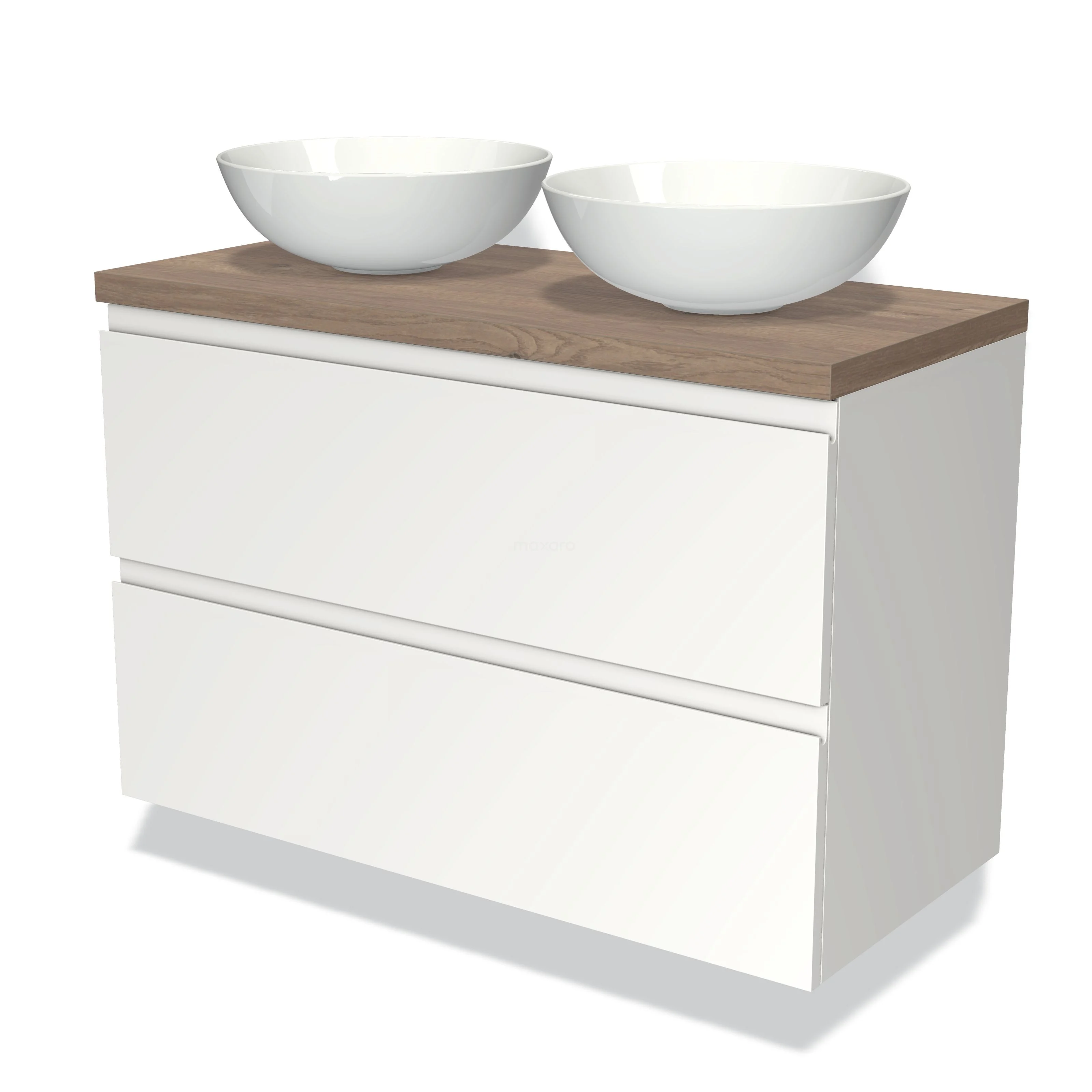 Modulo Plato Vanity units for countertop basin | 100 cm Matte white Handle-less front Mid brown oak worktop 2 Stacked drawers