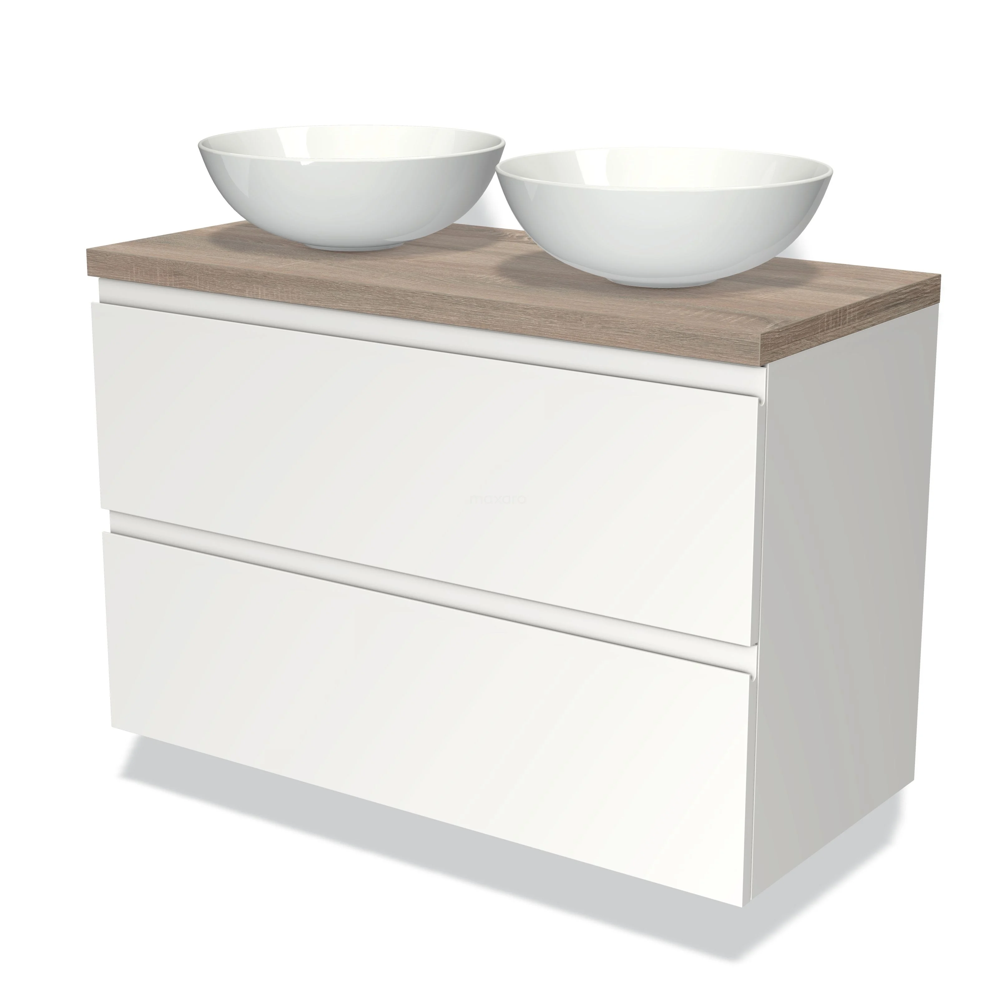 Modulo Plato Vanity units for countertop basin | 100 cm Matte white Handle-less front Oak worktop 2 Stacked drawers