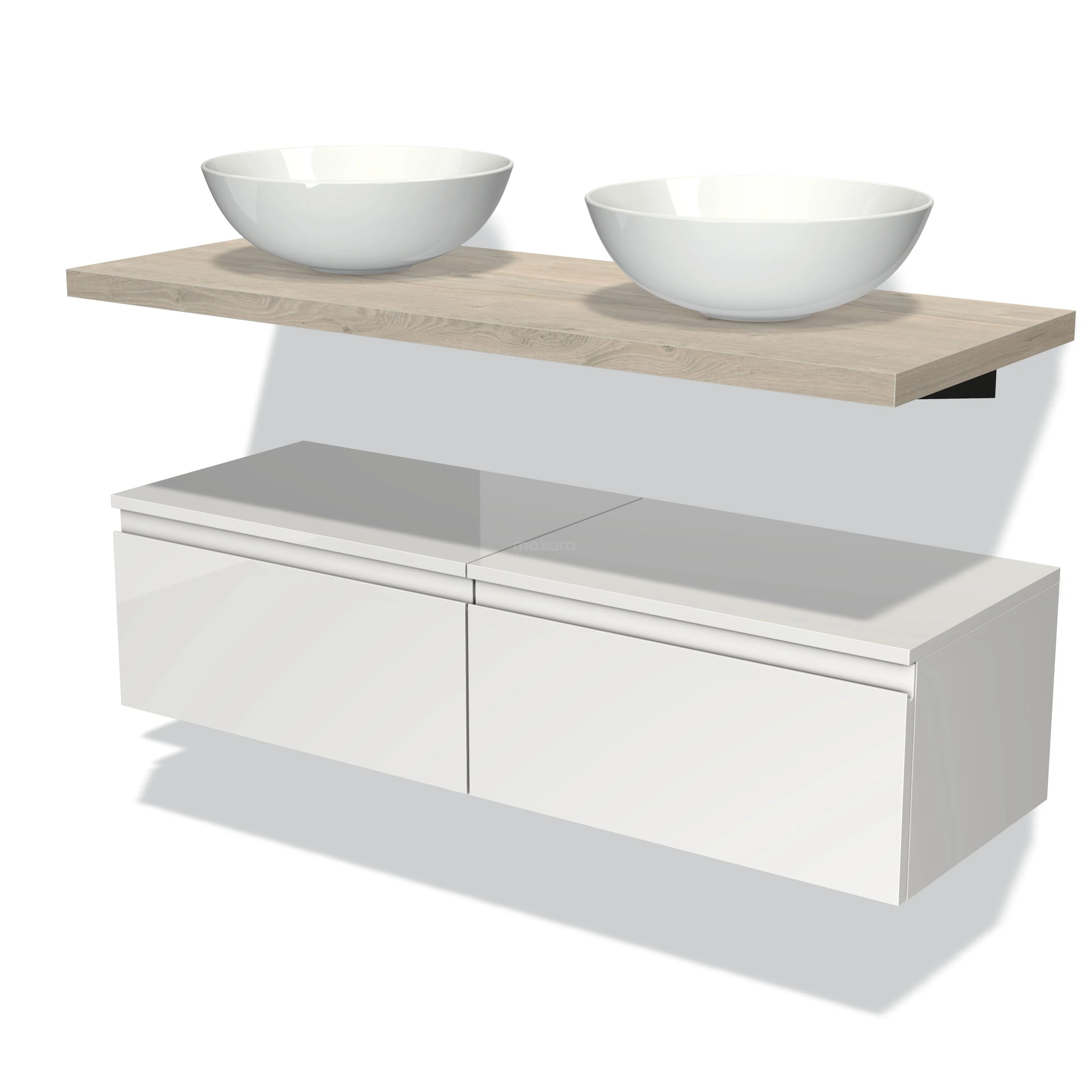 Modulo Plato Vanity units for countertop basin | 120 cm High-gloss white Handle-less front Light grey oak worktop Low floating