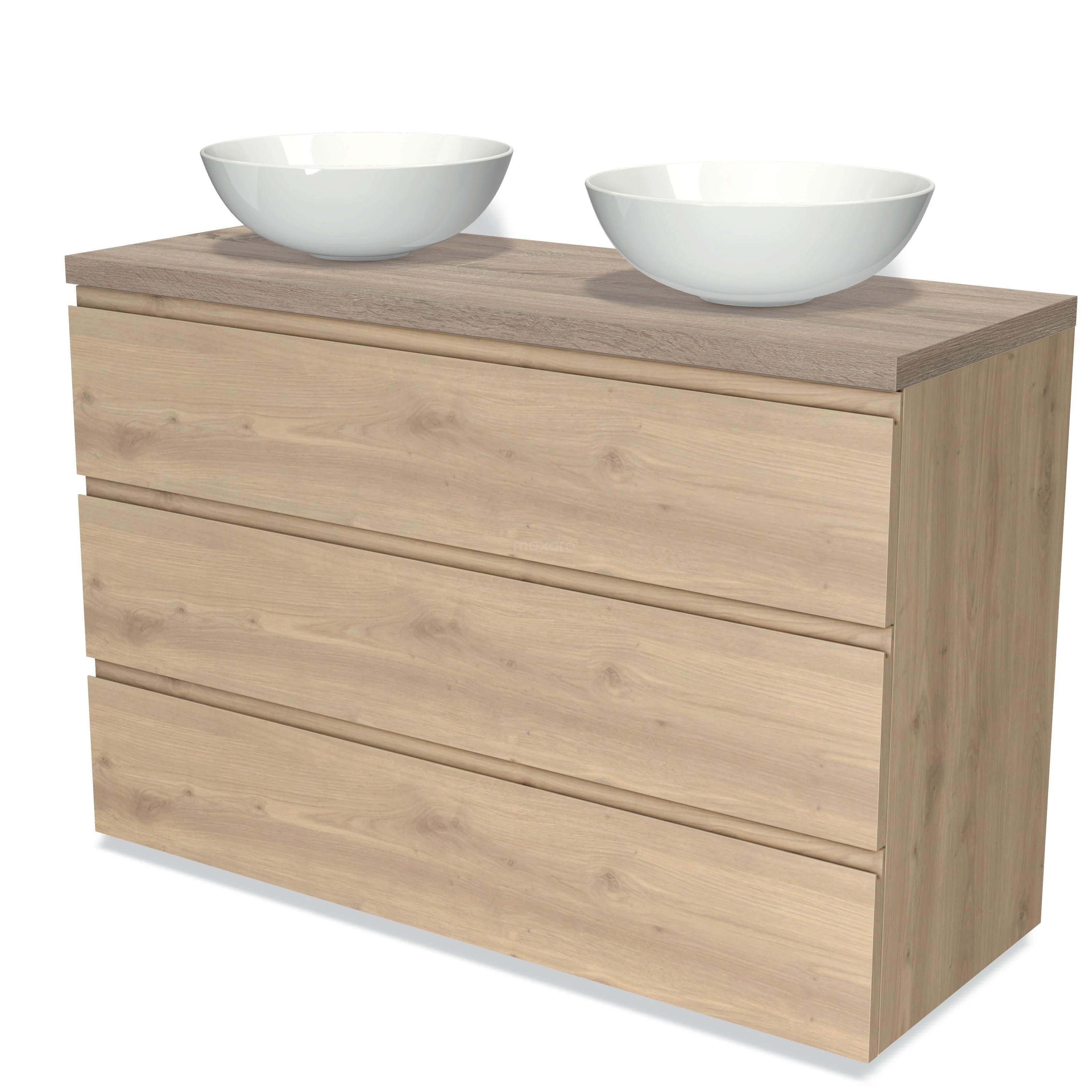 Modulo Plato Vanity units for countertop basin | 120 cm Light brown oak Handle-less front Oak worktop 3 drawers