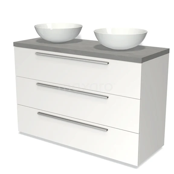 Modulo Plato Vanity units for countertop basin | 120 cm Matte white Flat front Light grey concrete worktop 3 drawers
