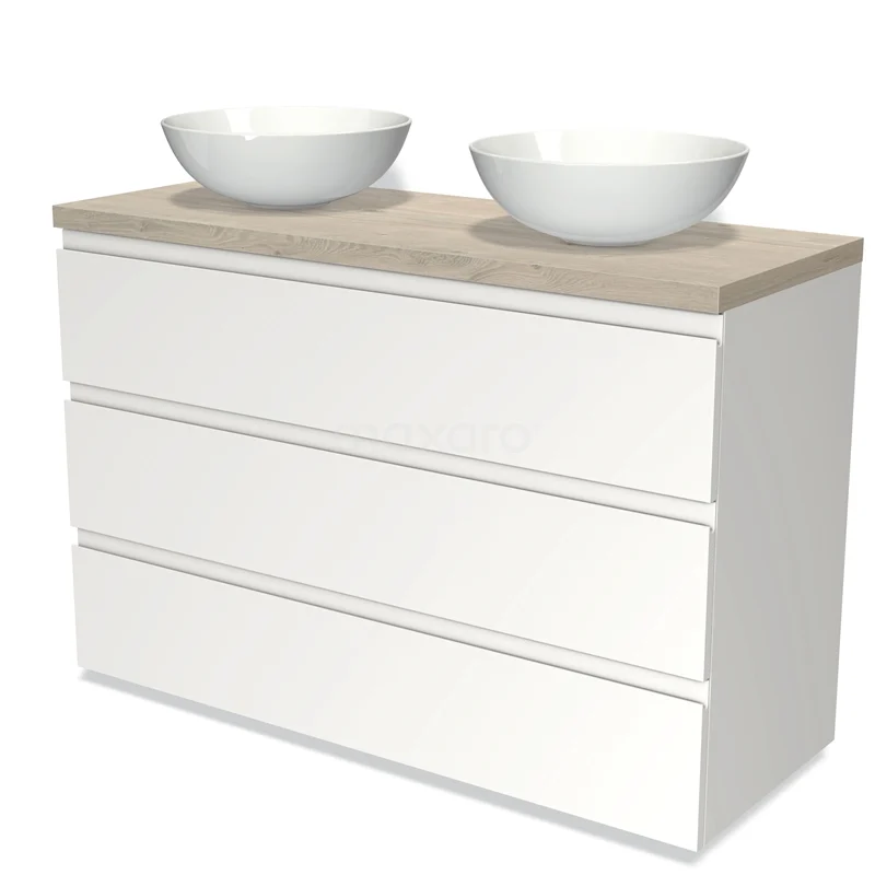 Modulo Plato Vanity units for countertop basin | 120 cm Matte white Handle-less front Light grey oak worktop 3 drawers
