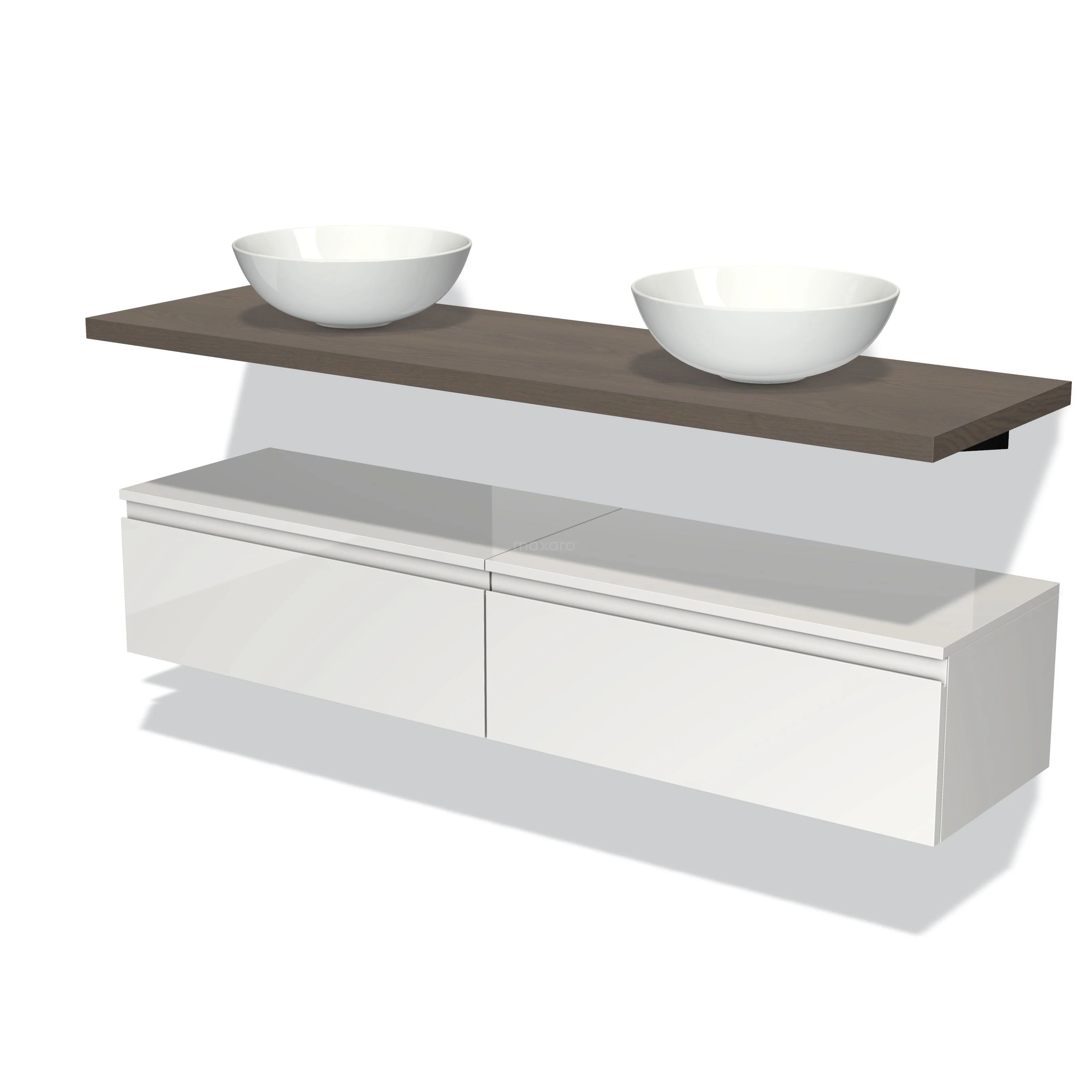 Modulo Plato Vanity units for countertop basin | 160 cm High-gloss white Handle-less front Dark brown oak worktop Low floating