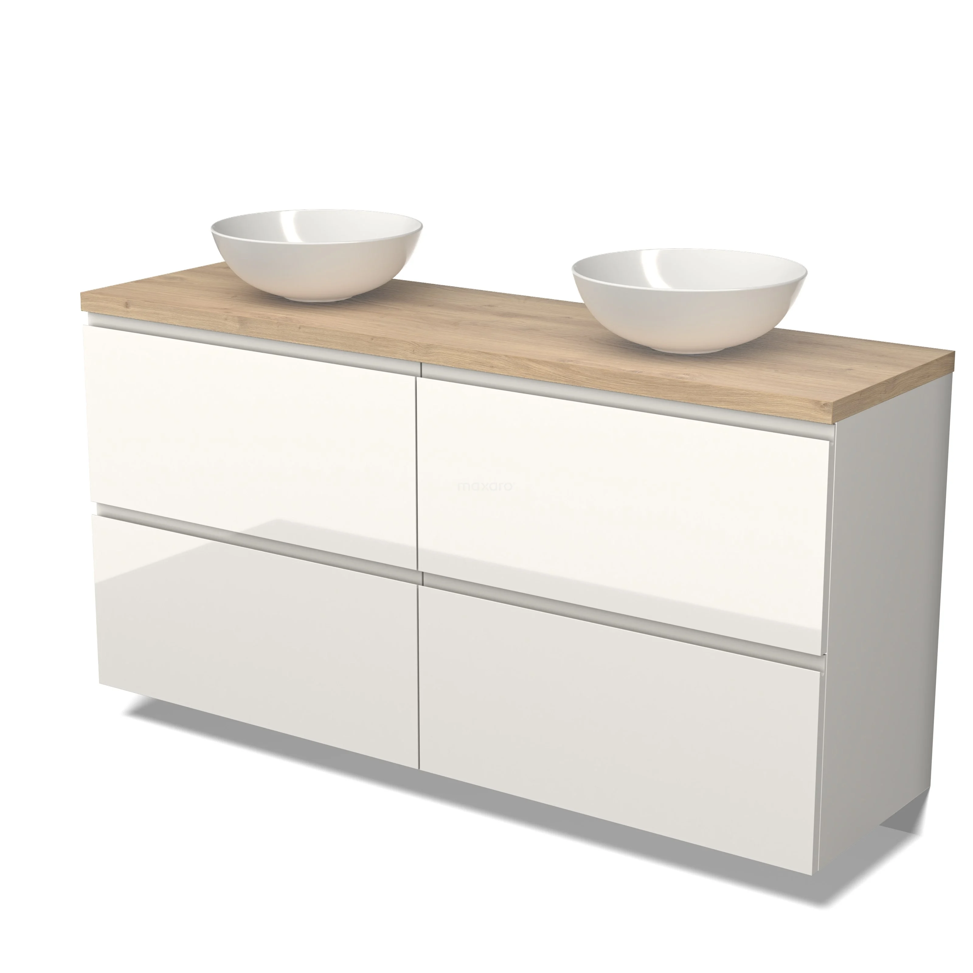 Modulo Plato Vanity units for countertop basin | 160 cm High-gloss white Handle-less front Light brown oak worktop 4 high drawers