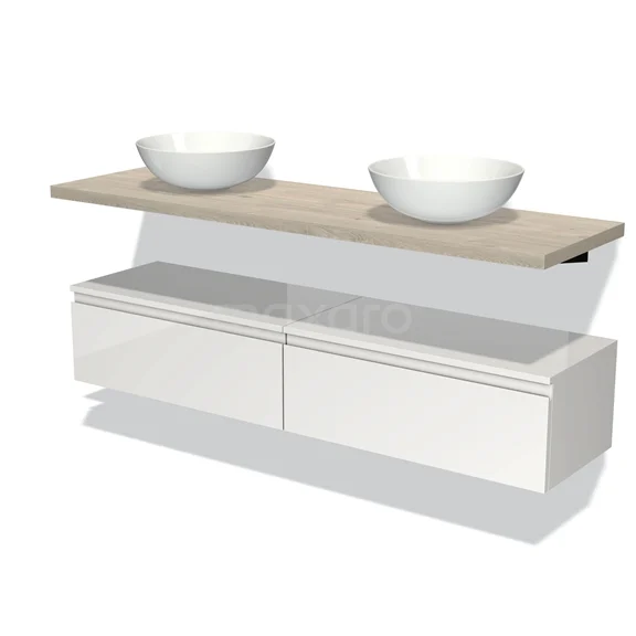 Modulo Plato Vanity units for countertop basin | 160 cm High-gloss white Handle-less front Light grey oak worktop Low floating