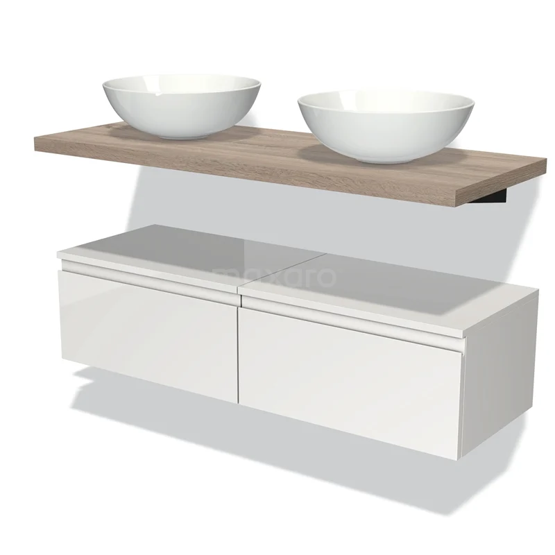 Modulo Plato Vanity units for countertop basin | 160 cm High-gloss white Handle-less front Oak worktop Low floating