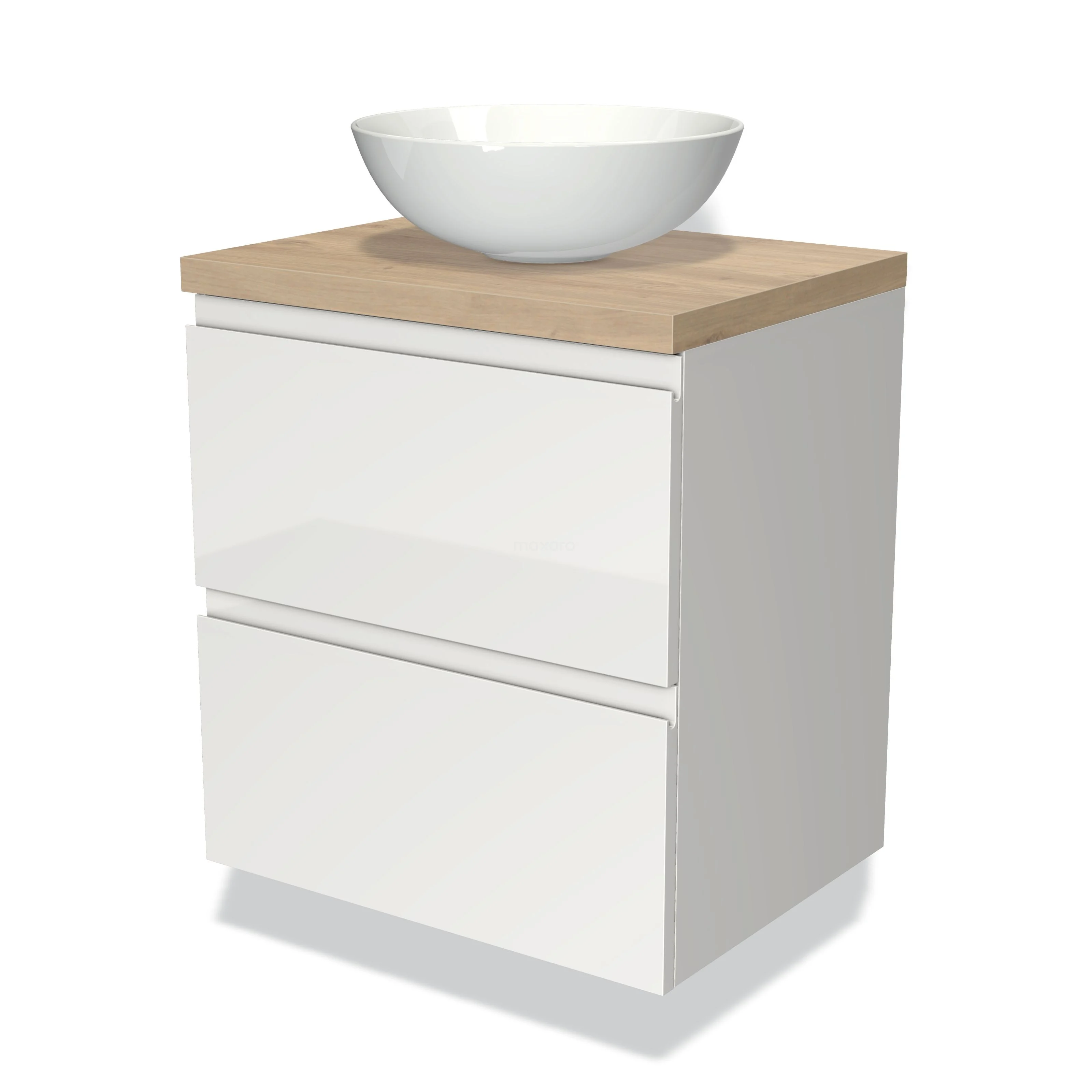 Modulo Plato Vanity units for countertop basin | 60 cm High-gloss white Handle-less front Light brown oak worktop 2 Stacked drawers