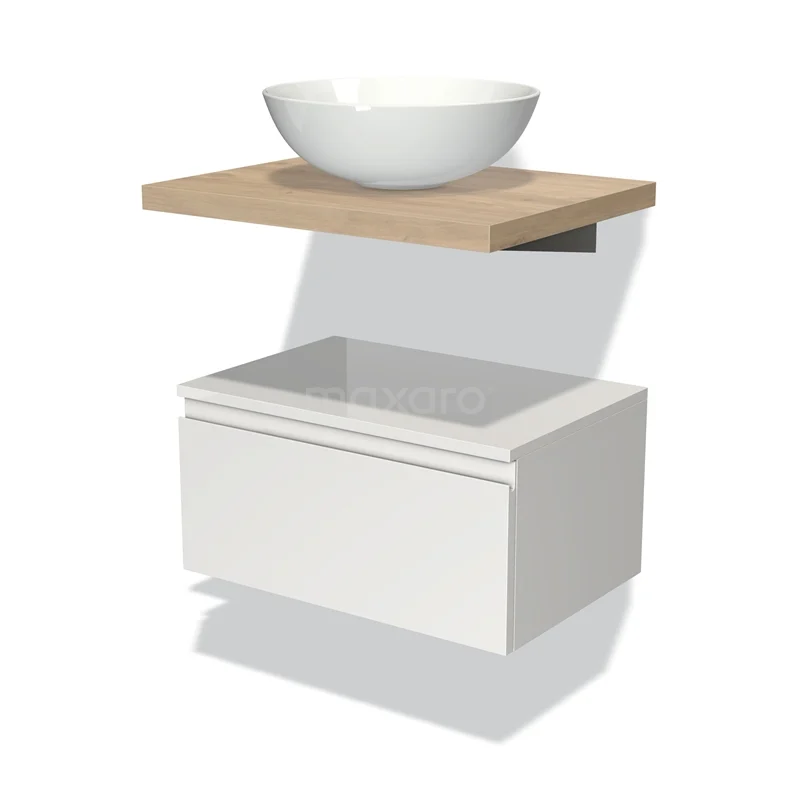 Modulo Plato Vanity units for countertop basin | 60 cm High-gloss white Handle-less front Light brown oak worktop Low floating
