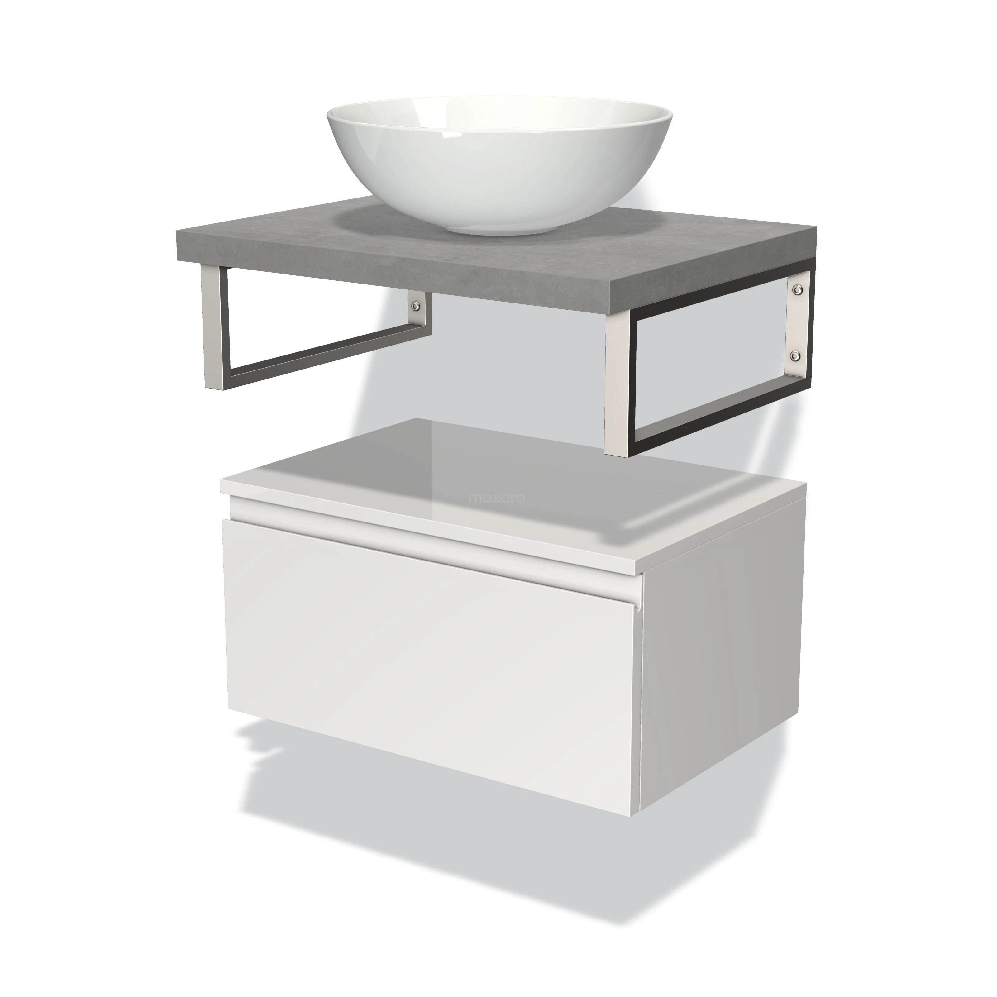 Modulo Plato Vanity units for countertop basin | 60 cm High-gloss white Handle-less front Light grey concrete worktop Low floating