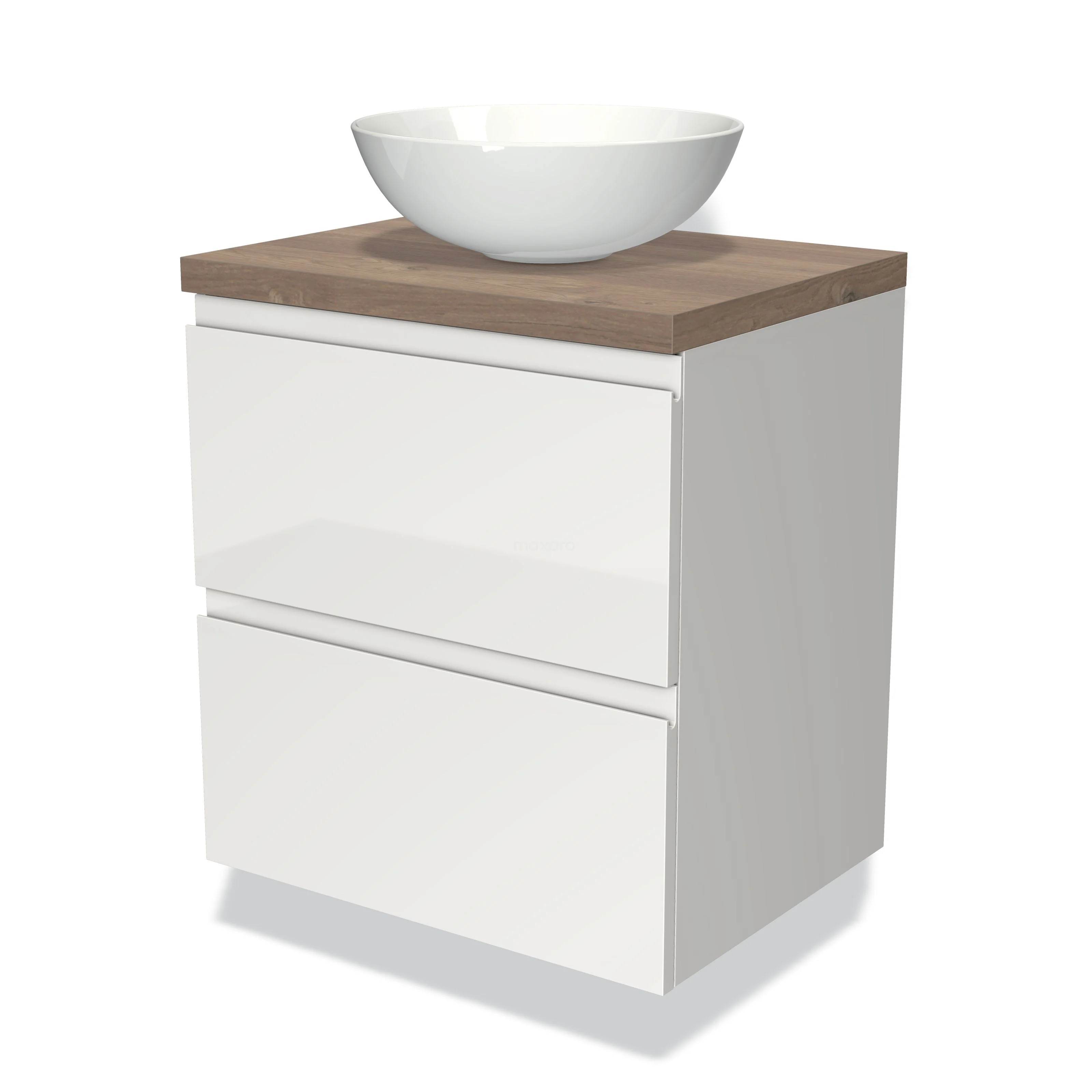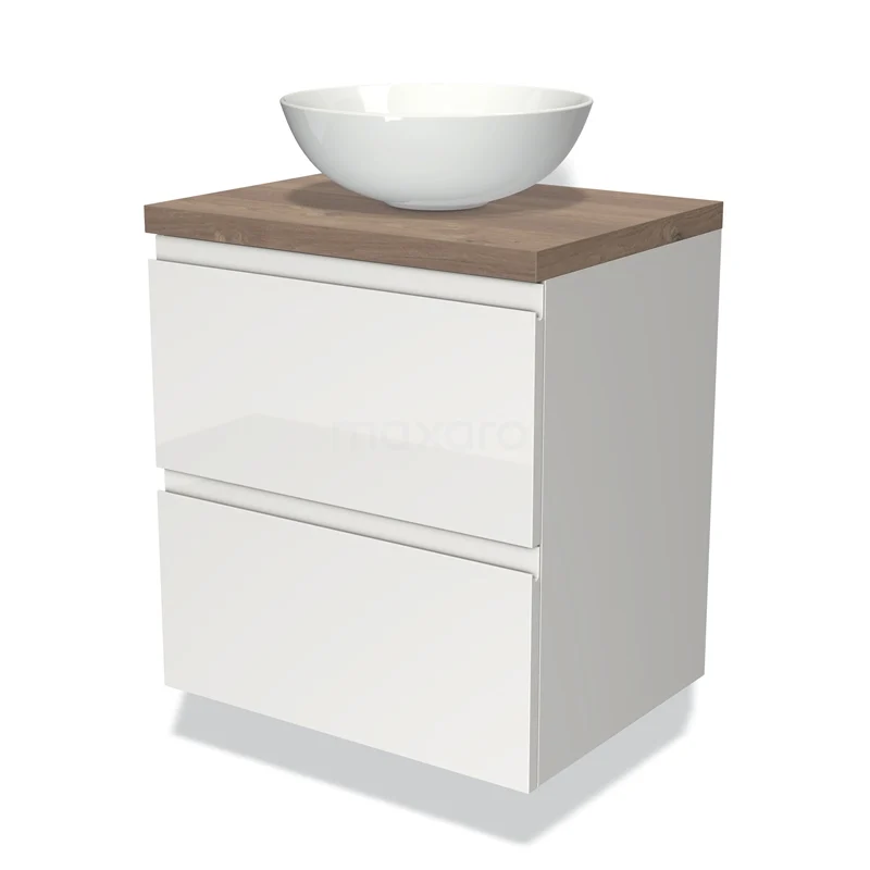 Modulo Plato Vanity units for countertop basin | 60 cm High-gloss white Handle-less front Mid brown oak worktop 2 Stacked drawers