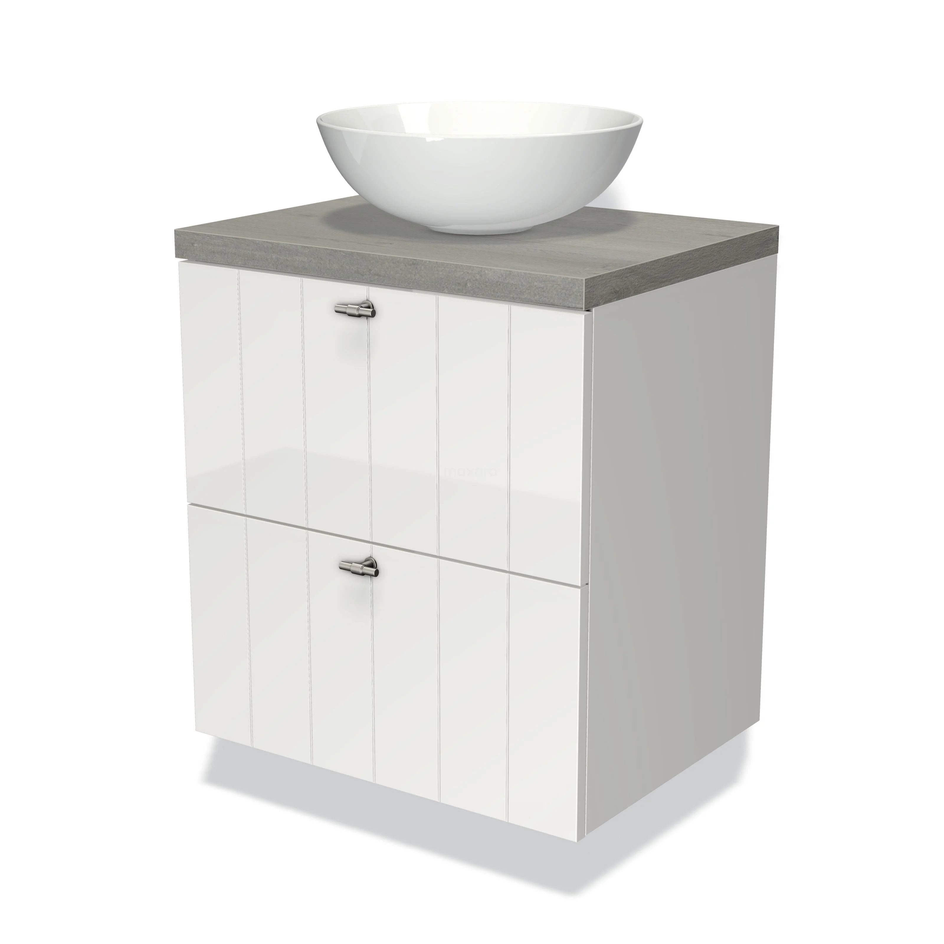 Modulo Plato Vanity units for countertop basin | 60 cm High-gloss white Slat front Grey oak worktop 2 Stacked drawers
