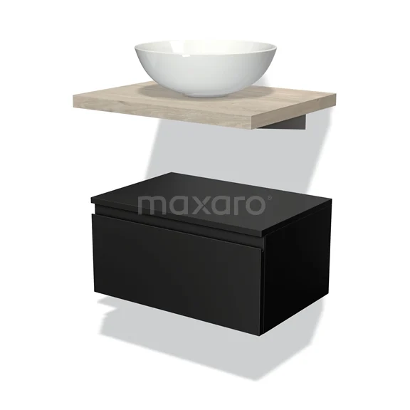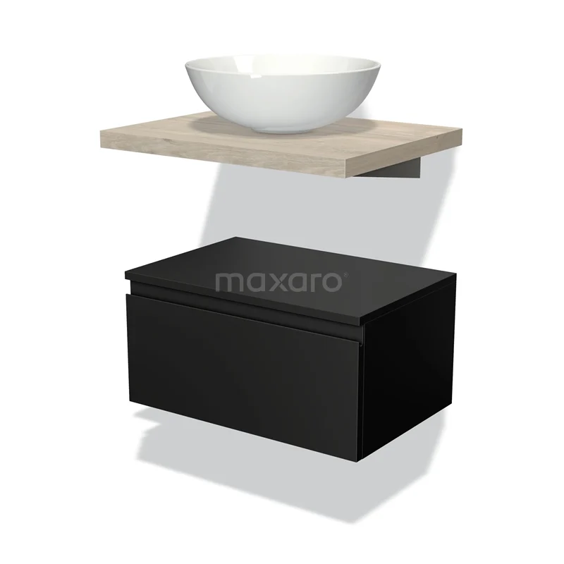 Modulo Plato Vanity units for countertop basin | 60 cm Matte black Handle-less front Light grey oak worktop Low floating