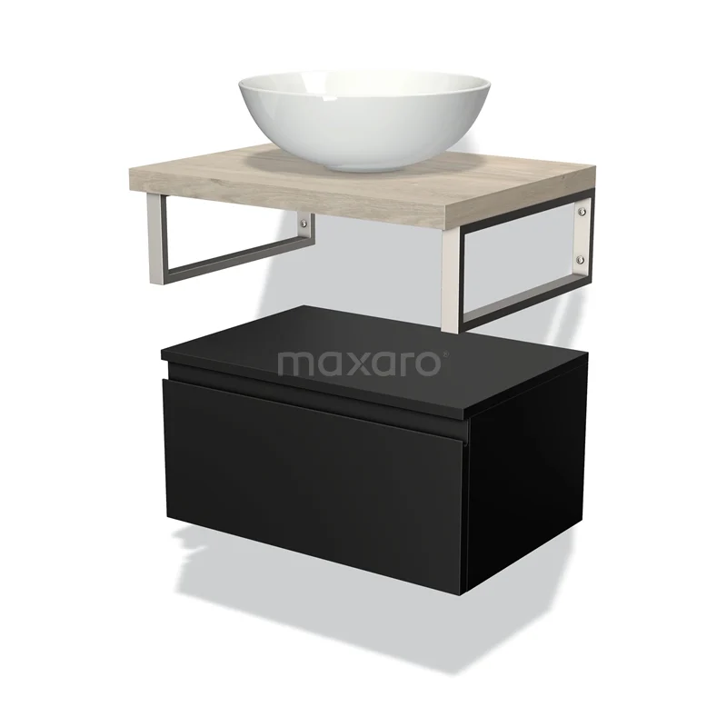 Modulo Plato Vanity units for countertop basin | 60 cm Matte black Handle-less front Light grey oak worktop Low floating