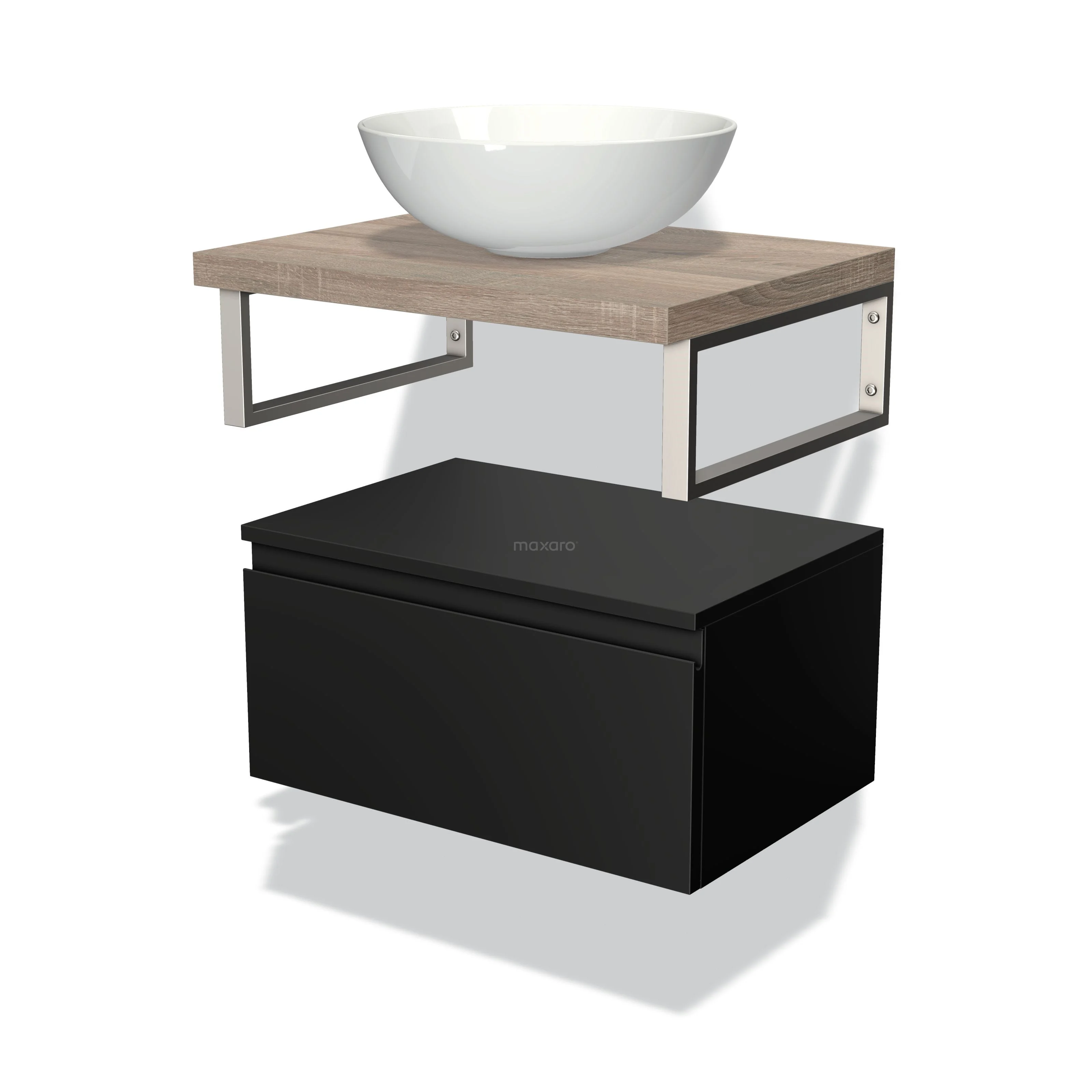 Modulo Plato Vanity units for countertop basin | 60 cm Matte black Handle-less front Oak worktop Low floating