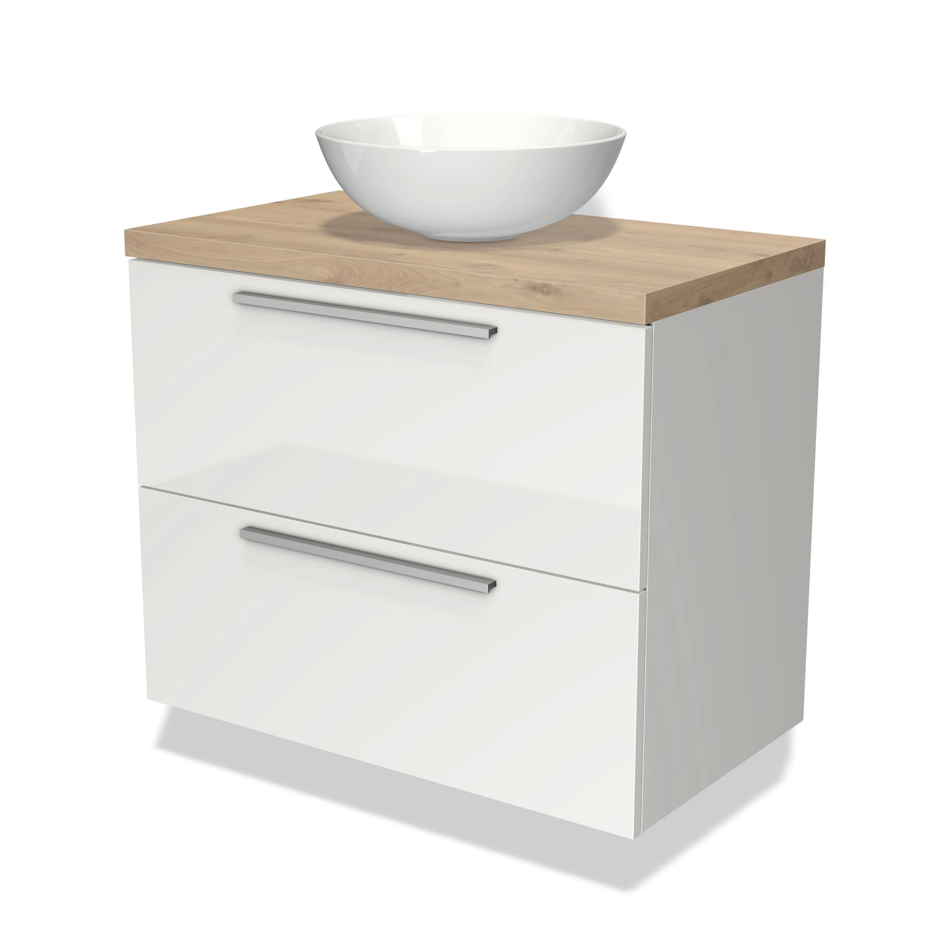 Modulo Plato Vanity units for countertop basin | 80 cm High-gloss white Flat front Light brown oak worktop 2 Stacked drawers