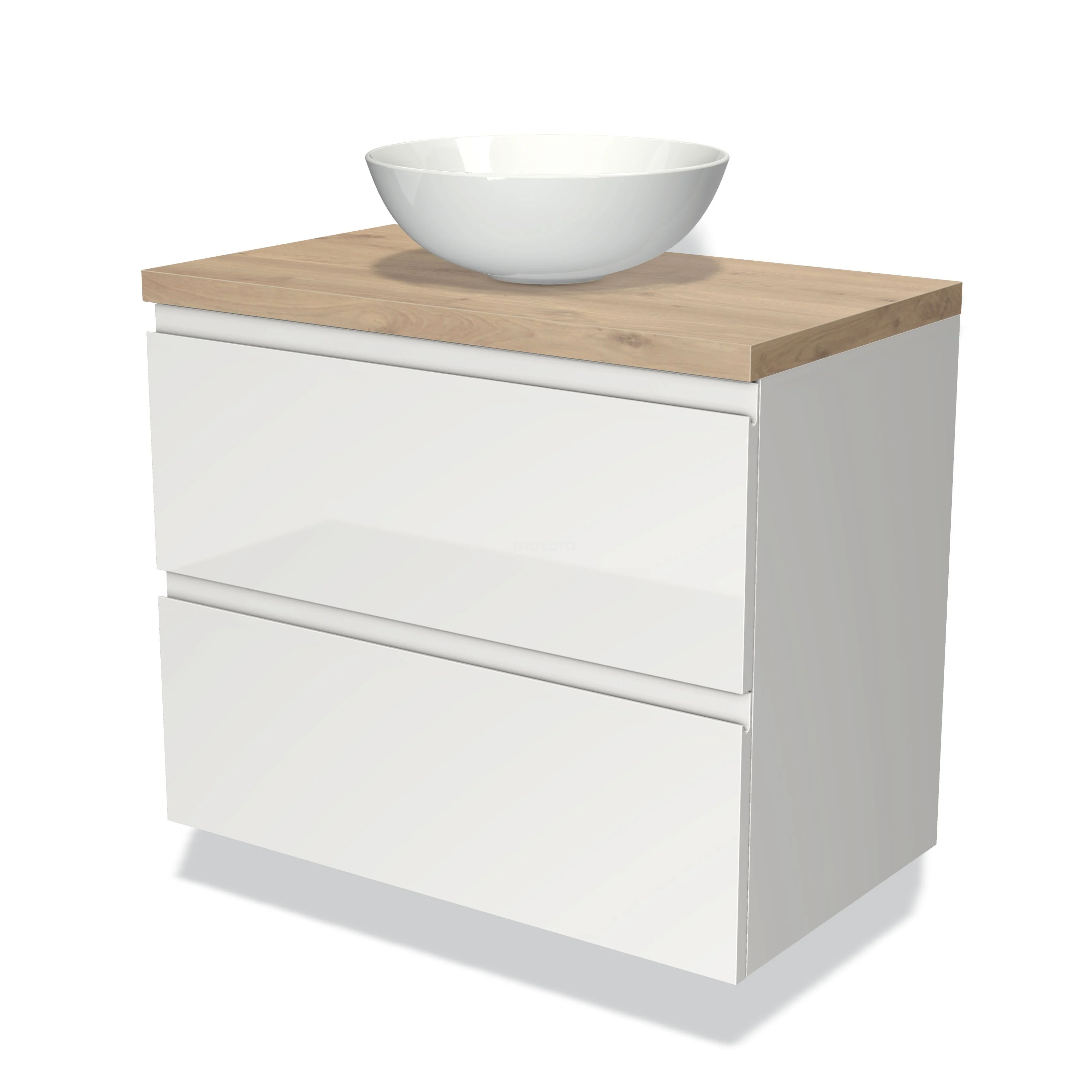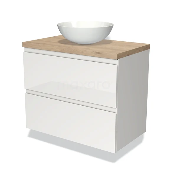 Modulo Plato Vanity units for countertop basin | 80 cm High-gloss white Handle-less front Light brown oak worktop 2 Stacked drawers