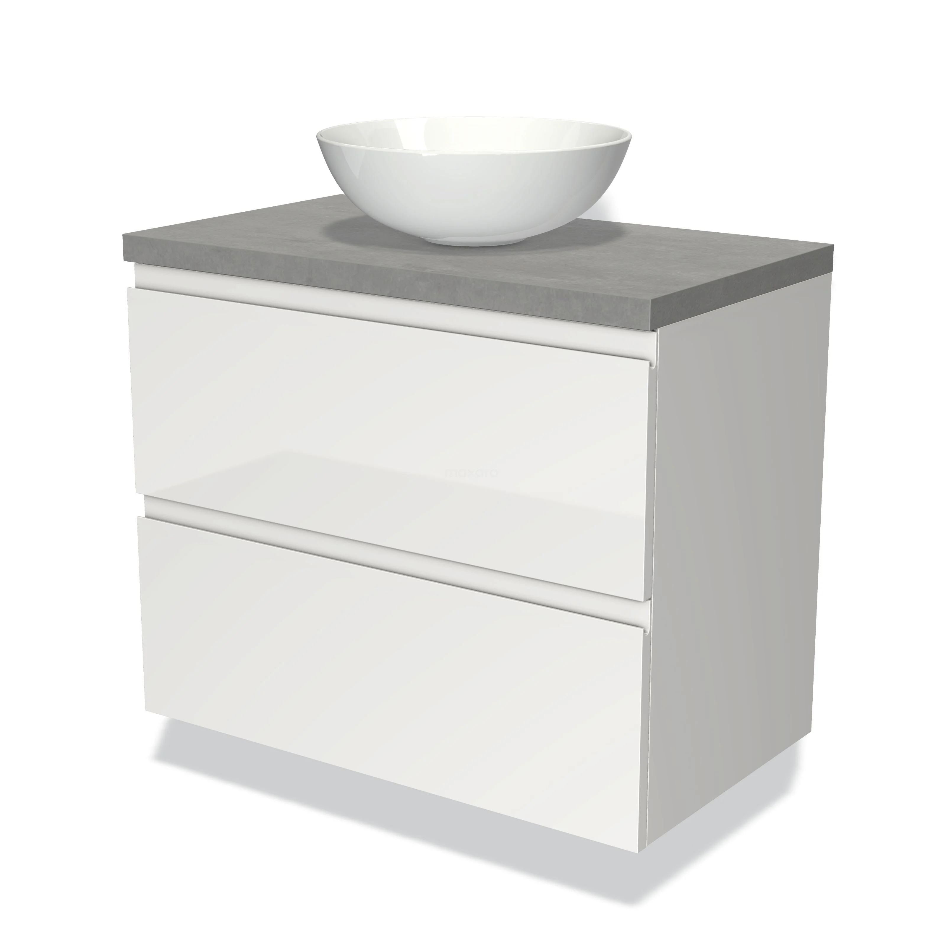Modulo Plato Vanity units for countertop basin | 80 cm High-gloss white Handle-less front Light grey concrete worktop 2 Stacked drawers