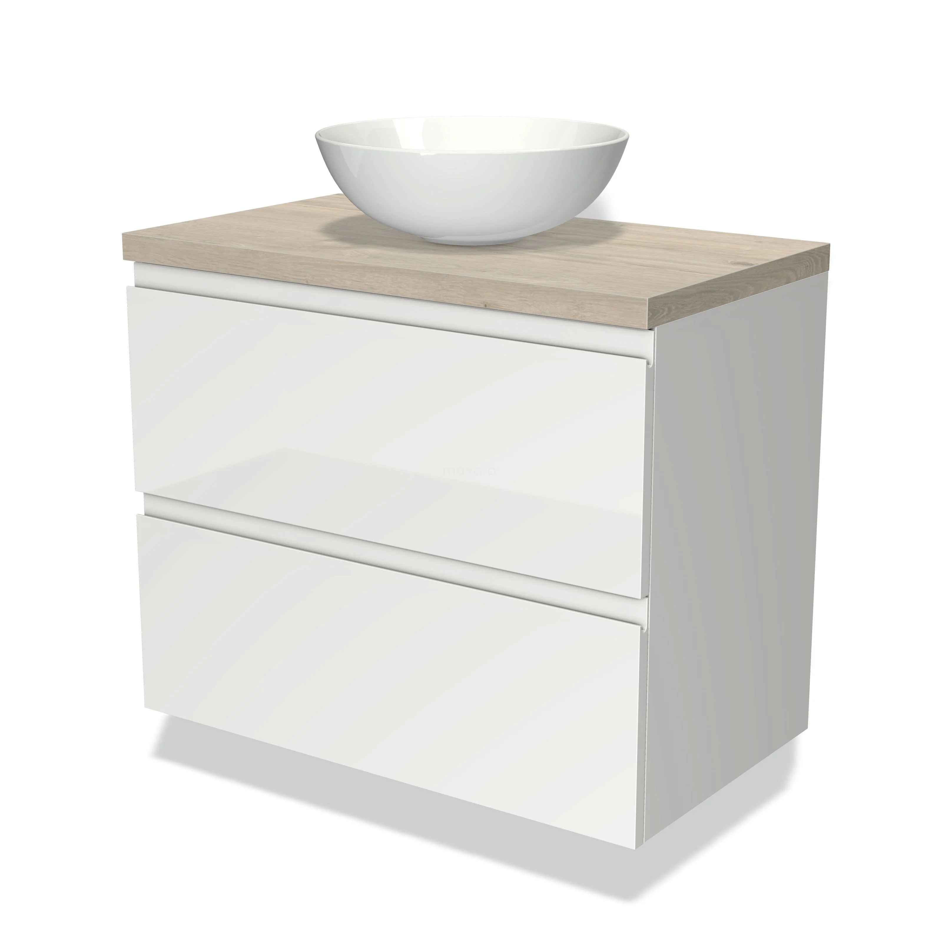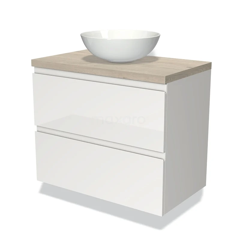 Modulo Plato Vanity units for countertop basin | 80 cm High-gloss white Handle-less front Light grey oak worktop 2 Stacked drawers
