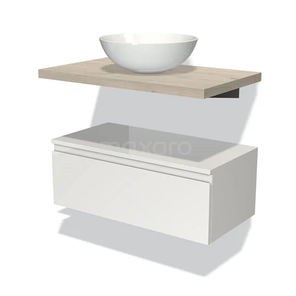 Modulo Plato Vanity units for countertop basin | 80 cm High-gloss white Handle-less front Light grey oak worktop Low floating