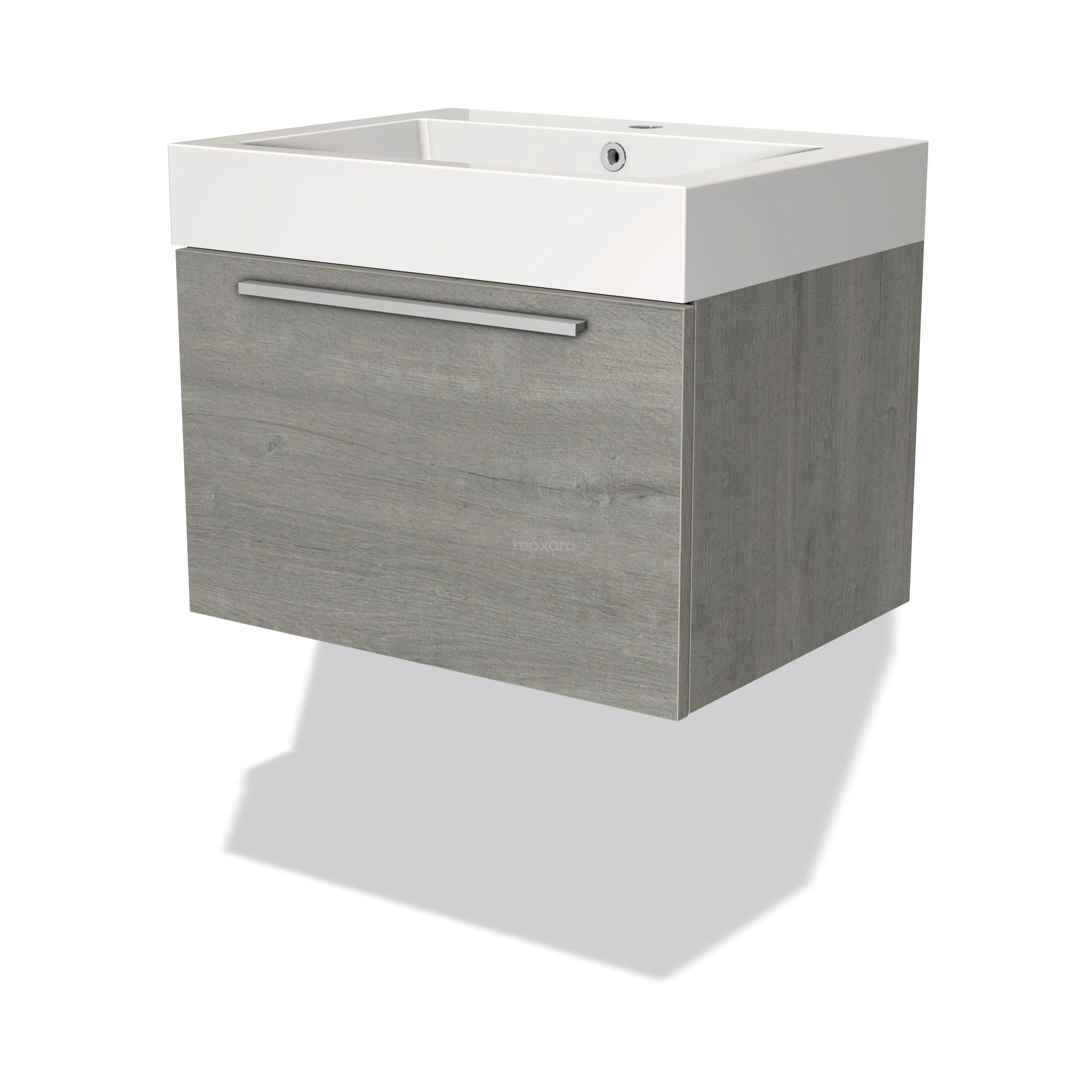 Grey wooden bathroom unit with white ceramic vanity units with basin, floating design and metal handle. Perfect for modern bathrooms.
