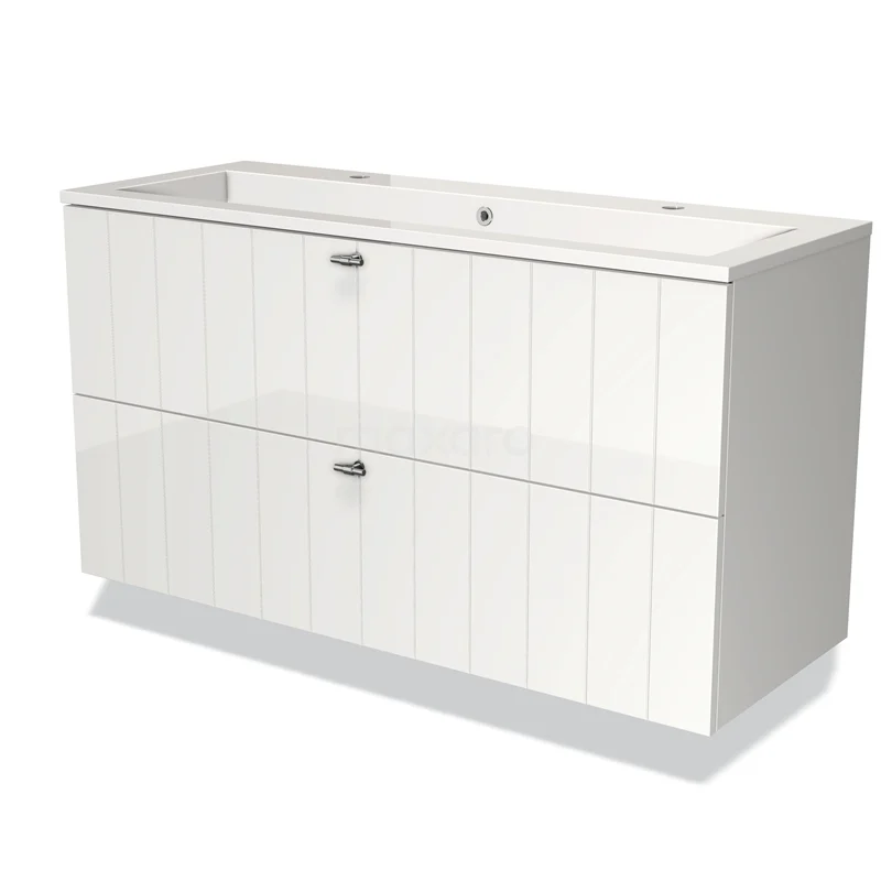 Modulo Vanity units with basin | 120 cm High-gloss white Slat front Mineral marble 2 Stacked drawers