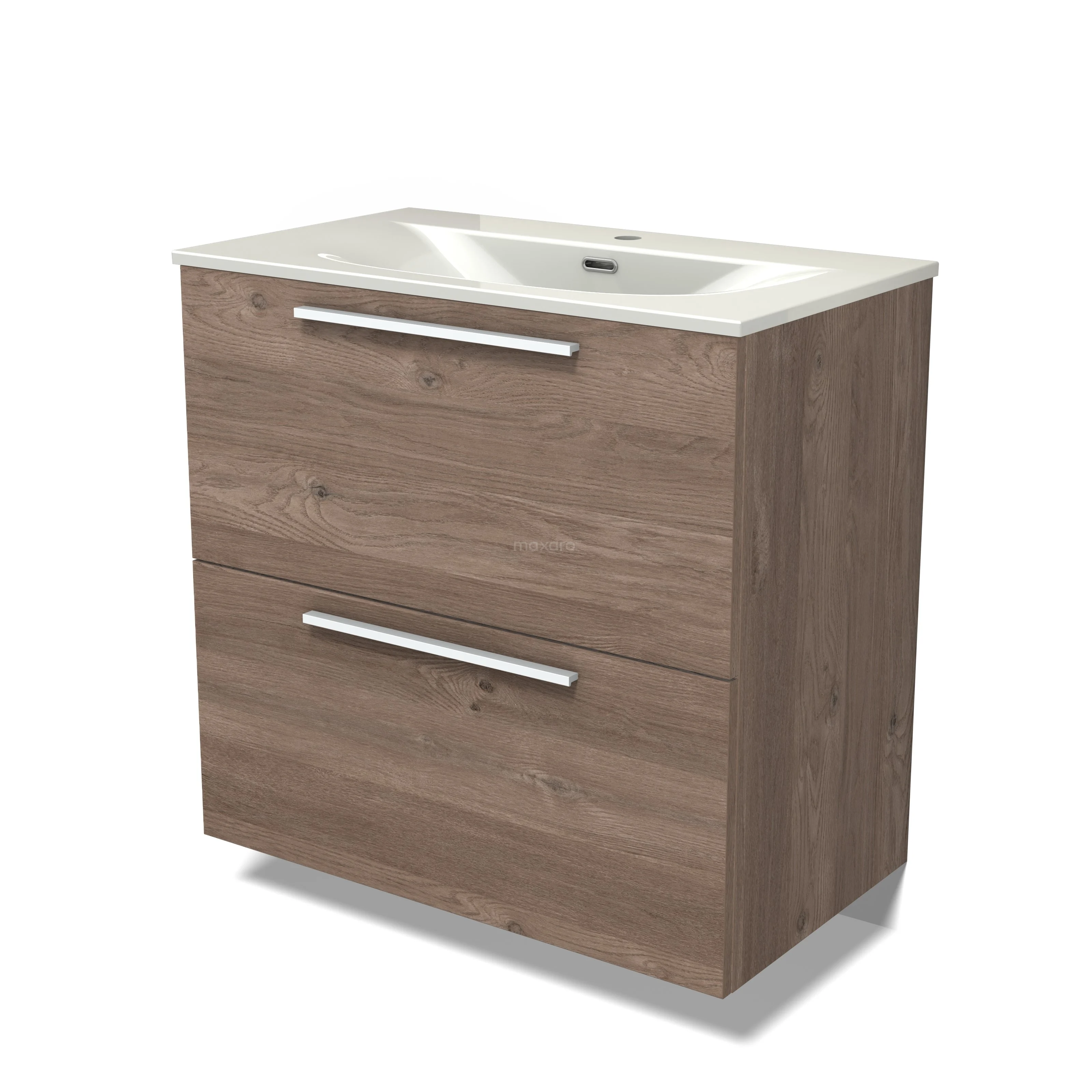 Modulo Vanity units with basin | 80 cm Mid brown oak Flat front Ceramic 2 stacked drawers under each other