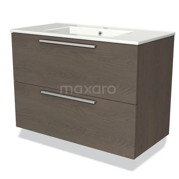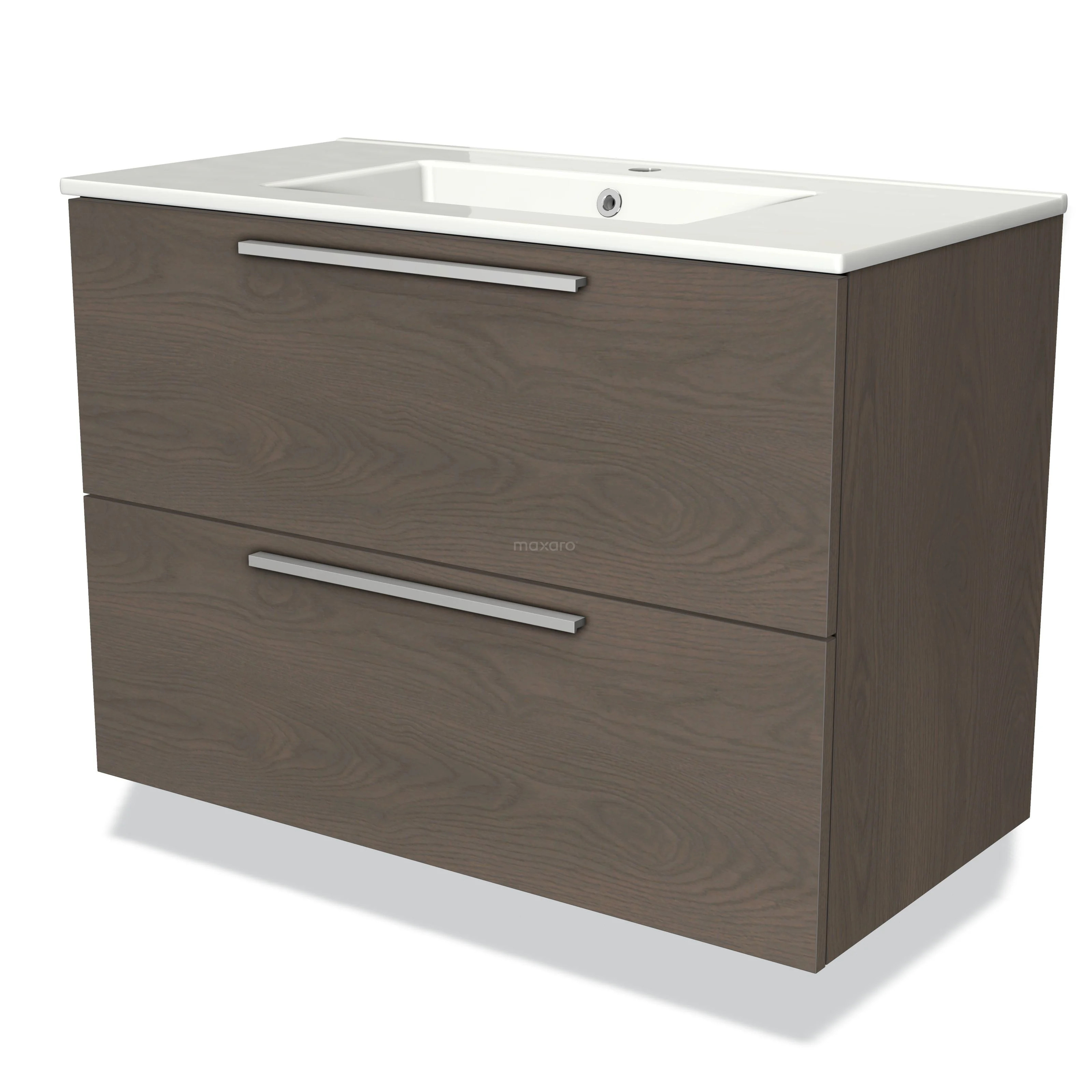 Modulo Vanity units with basin | 90 cm Dark brown oak Flat front Ceramic 2 Stacked drawers