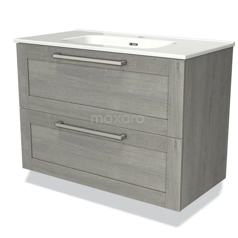 Modulo Vanity units with basin | 90 cm Grey oak Frame front Ceramic 2 Stacked drawers