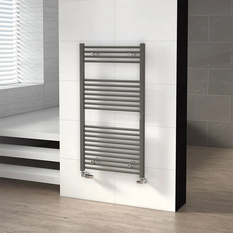 Cv towel radiator This one heats via central heating, which requires a central heating connection or heat pump. Furthermore, you will need to purchase a radiator valve set to connect the radiator to the pipes. The sets are available in different finishes. Which one you need depends on how the central heating supply and return pipes enter the room. Besides central heating, the radiator also lends itself to electric heating by means of an electric heating element.