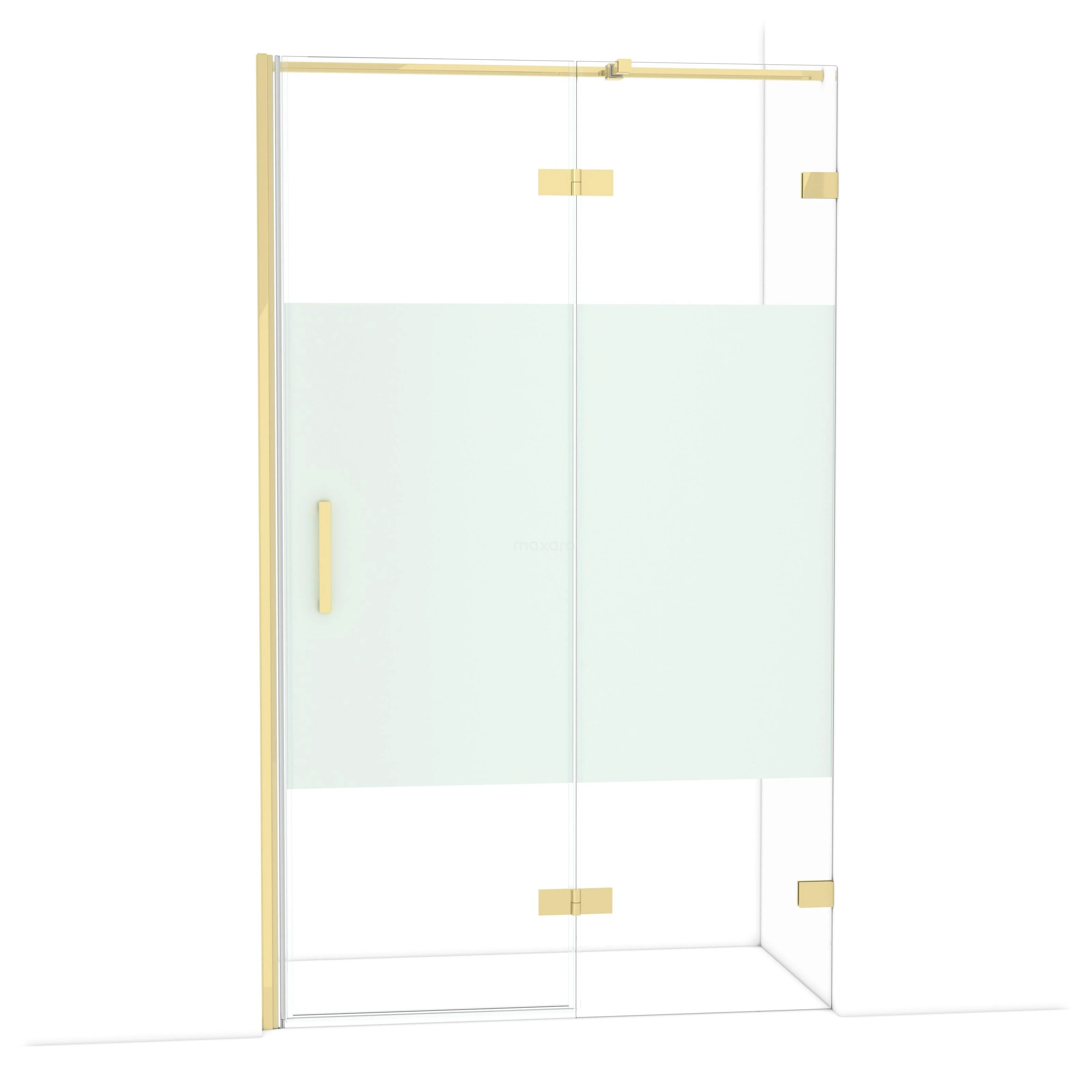 The Diamond hinged door of 120 cm is ideal for closing off your shower space. This model features a refined and luxurious design in shiny light gold and is equipped with high-quality hinges, two-point fixation, and a vertical handle. The clear glass with a matte strip provides more privacy. Thanks to its adjustability, you can easily make the shower door fit. The total width is adjustable from 121.7 to 122.7 cm.
