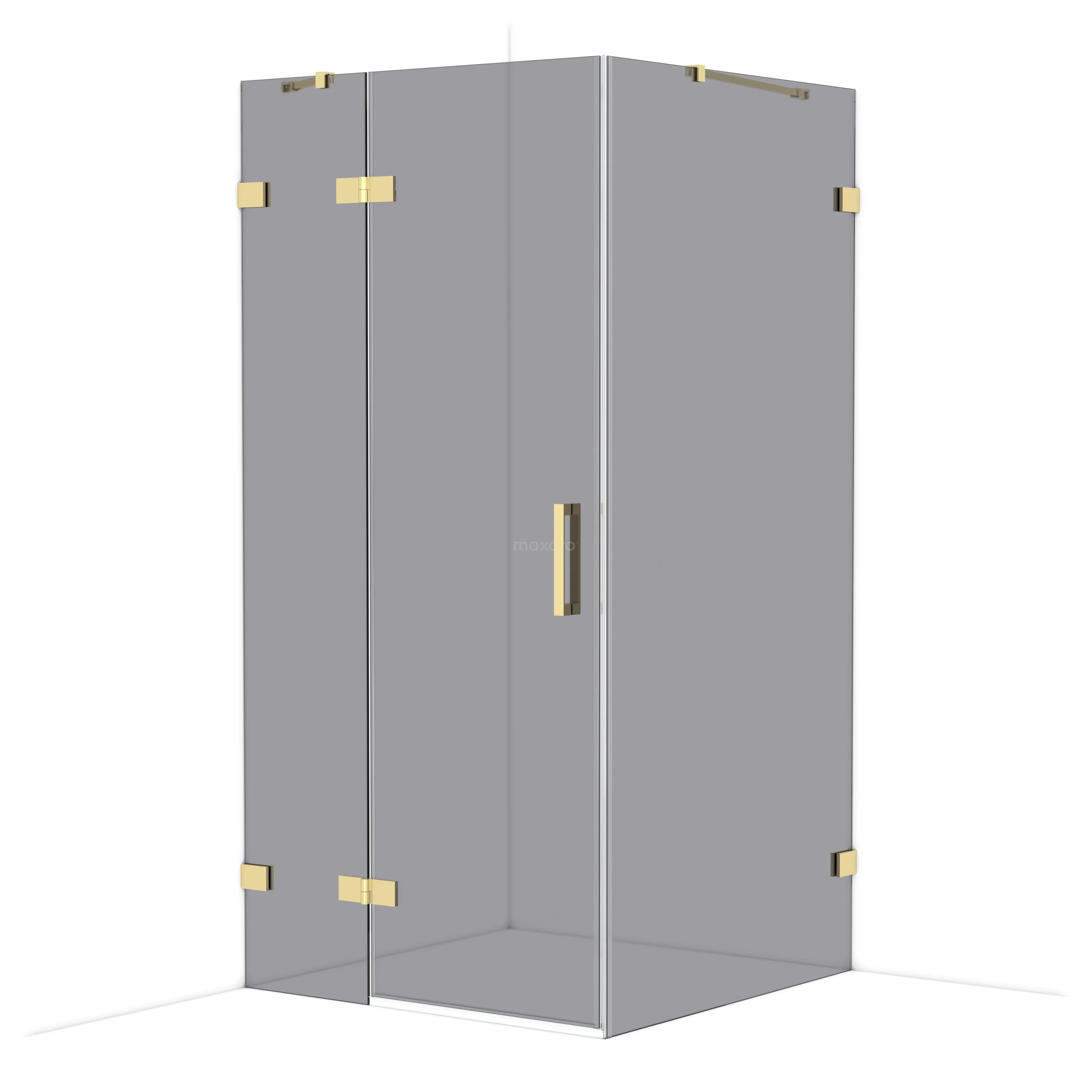 Grey glass shower cabin with gold hinges and handle, minimalist design, perfect for modern bathrooms.
