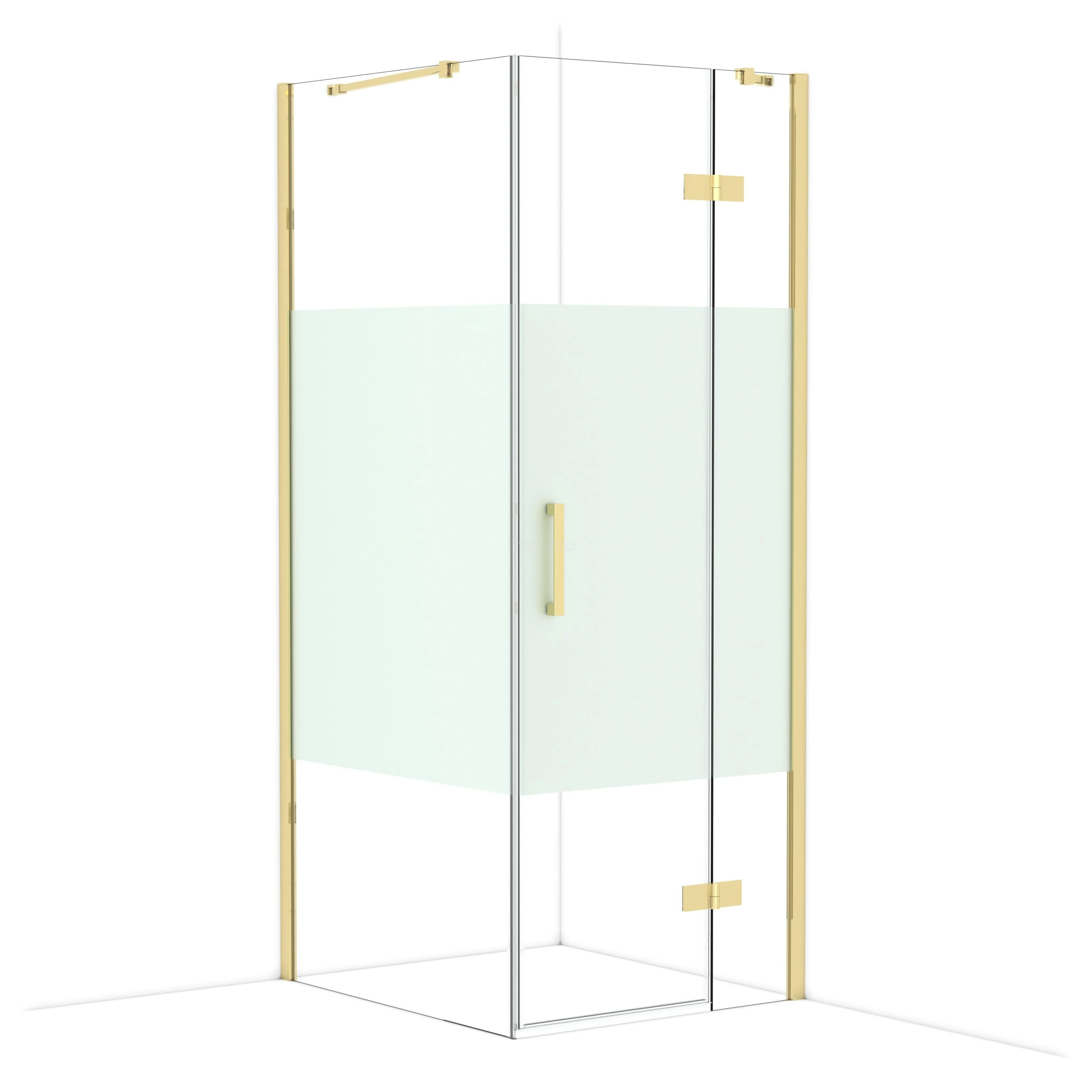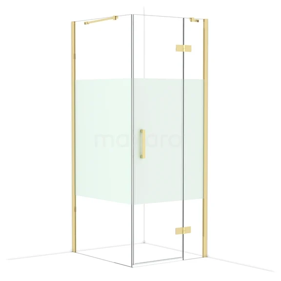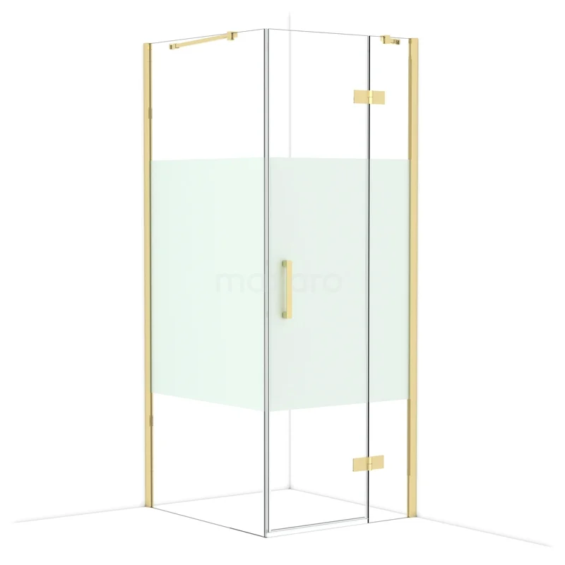 Corner shower with gold-coloured profiles, clear glass and matte glass detail for stylish bathroom decor.