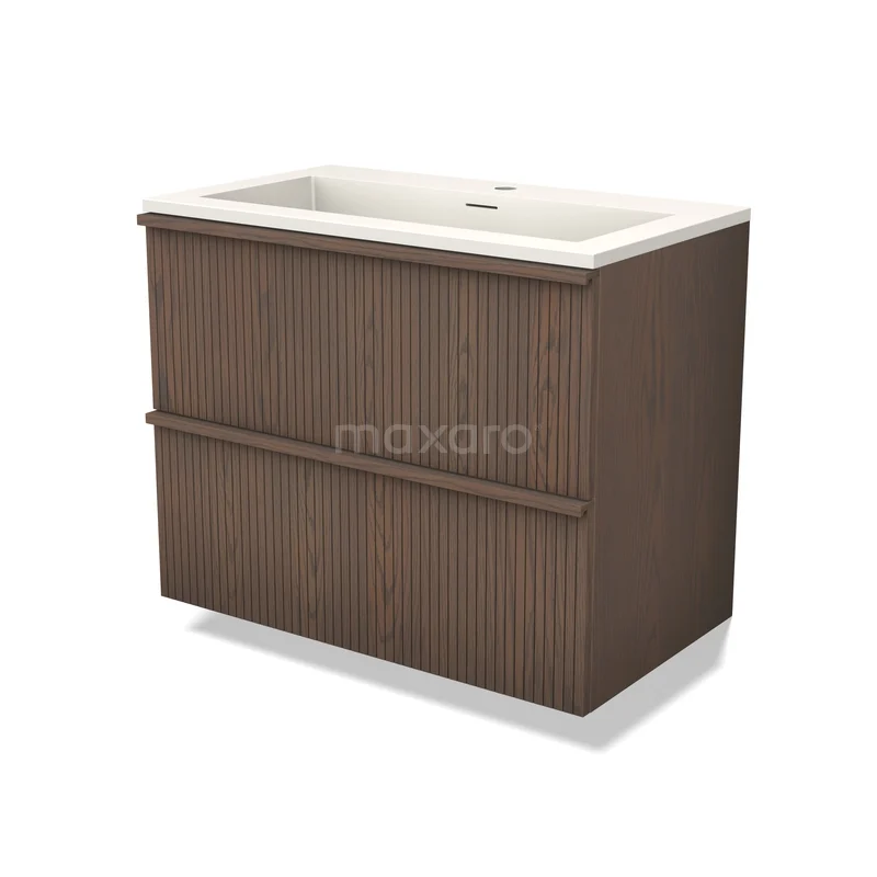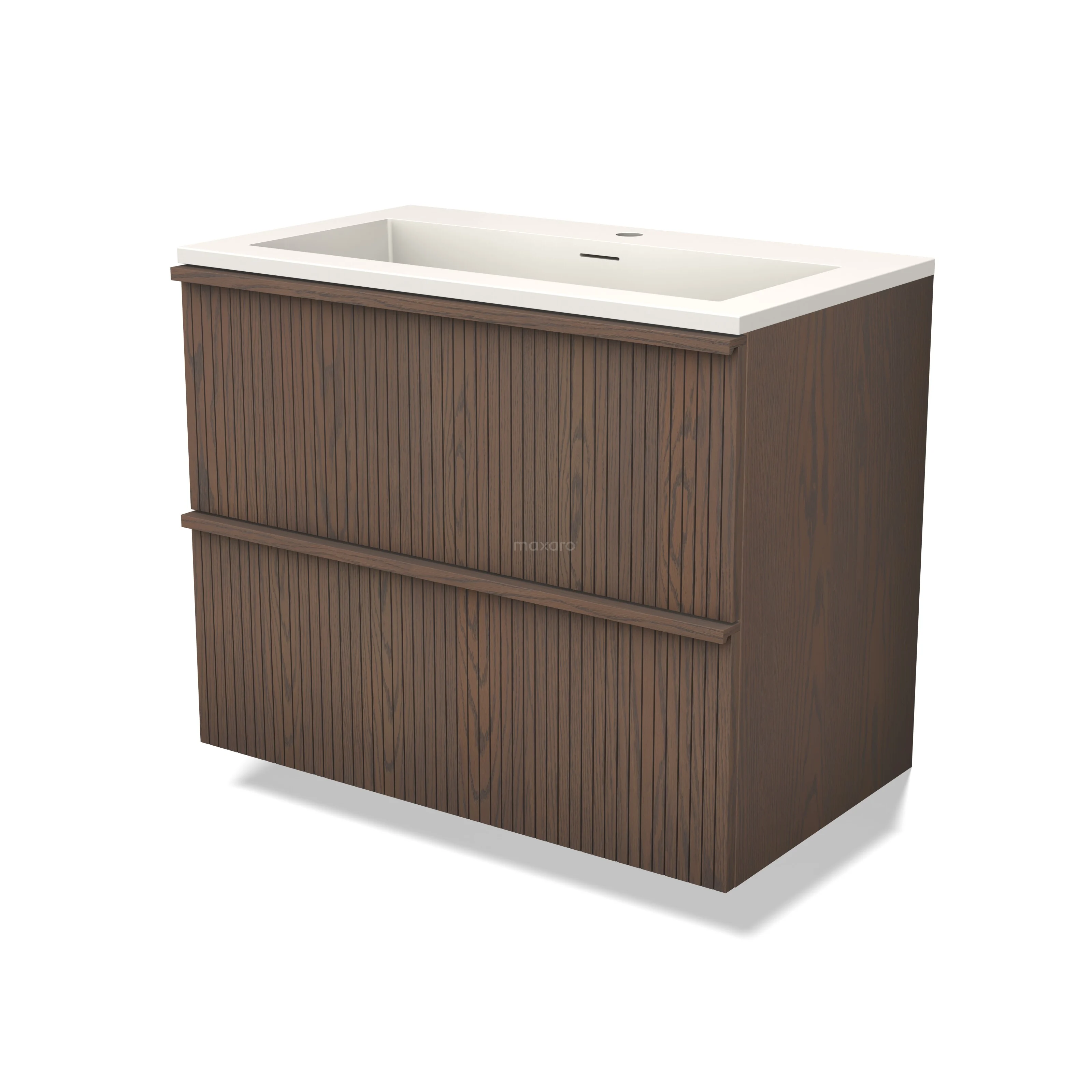 Modulo Plus onderscheidt zich door zijn unieke fronttypes en elegante, afgeronde vormgeving. Het ribbelfront kenmerkt zich door verfijnde verticale lijnen en een houten handgreep over de gehele bovenzijde, wat zorgt voor een trendy en stijlvol design, terwijl het natuurlijke hout en het subtiele lijnenspel een warme, exclusieve uitstraling geven. Met een breedte van 80 cm biedt het meubel volop ruimte voor jouw dagelijkse verzorging.