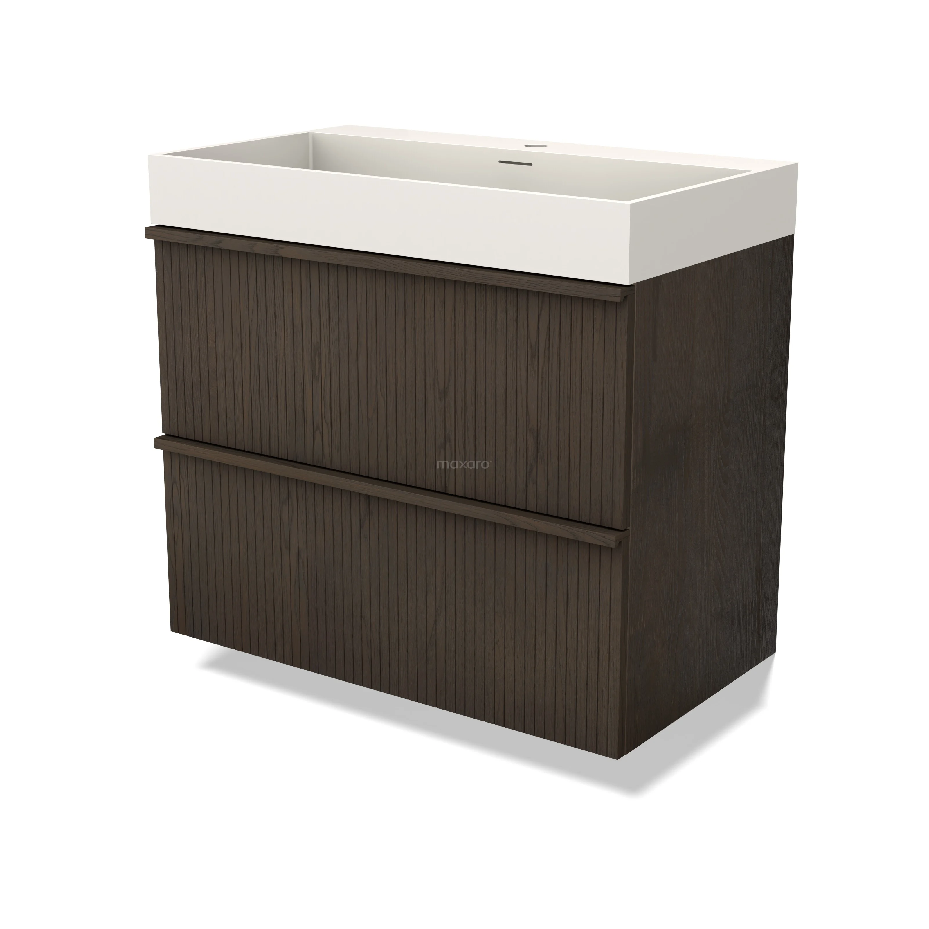 Modulo Plus onderscheidt zich door zijn unieke fronttypes en elegante, afgeronde vormgeving. Het ribbelfront kenmerkt zich door verfijnde verticale lijnen en een houten handgreep over de gehele bovenzijde, wat zorgt voor een trendy en stijlvol design, terwijl het natuurlijke hout en het subtiele lijnenspel een warme, exclusieve uitstraling geven. Met een breedte van 80 cm biedt het meubel volop ruimte voor jouw dagelijkse verzorging.