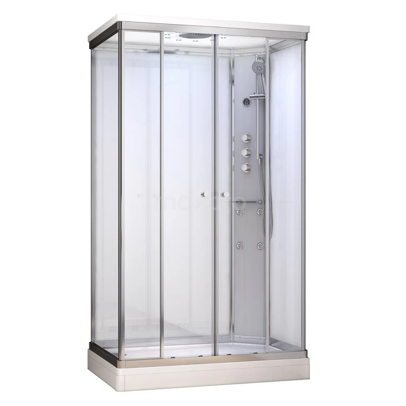 Dit rechthoekige model van 140x90 cm biedt u alle bewegingsvrijheid die u zich kunt wensen. U stapt er makkelijk recht in en sluit de schuifdeuren met een soepele beweging. Doordat de deuren dubbele uitklikbare wielen hebben, maakt u de rails eenvoudig brandschoon. De cabine heeft 6 mm helder en wit veiligheidsglas. Samen met de zilver gepoedercoate omlijsting zorgt dit voor een moderne uitstraling. De douchebak en het dak zijn gemaakt van kwalitatief mineraalmarmer.