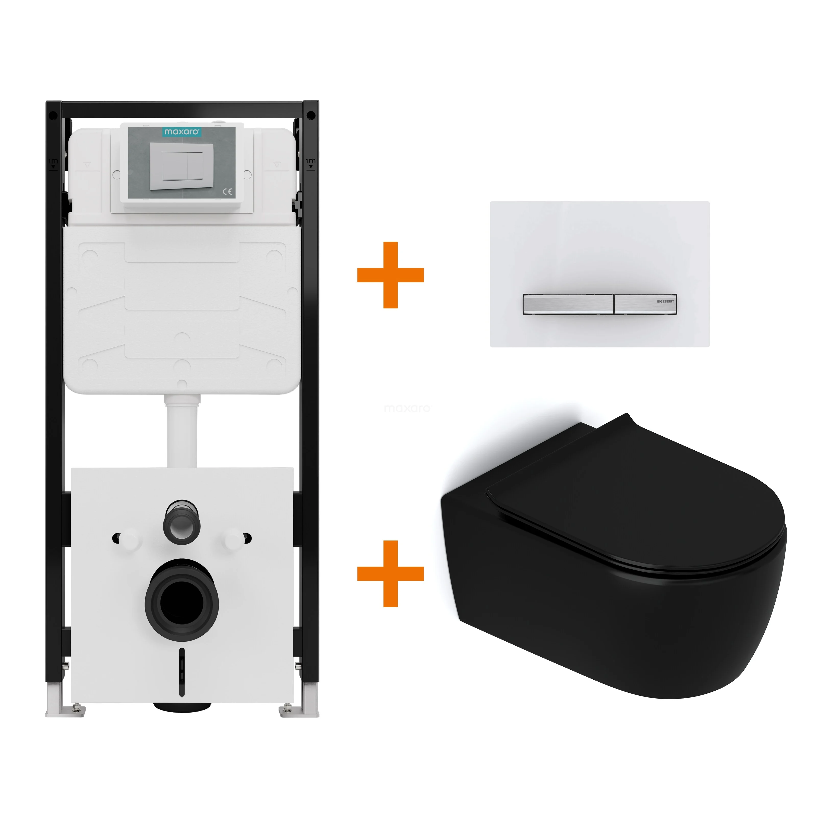 Toiletset Mat zwart zonder Spoelrand + Maxaro Flush Pro inbouwreservoir met geluidsisolatie