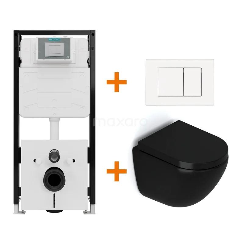 Toiletset Mat zwart zonder Spoelrand + Maxaro Flush Pro inbouwreservoir met geluidsisolatie