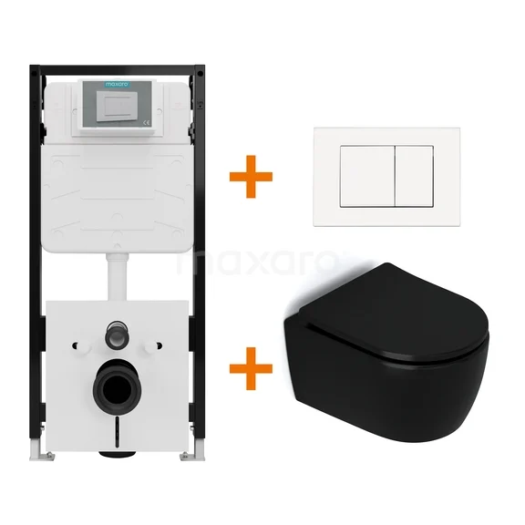 Toiletset Mat zwart zonder Spoelrand + Maxaro Flush Slim Pro inbouwreservoir met geluidsisolatie