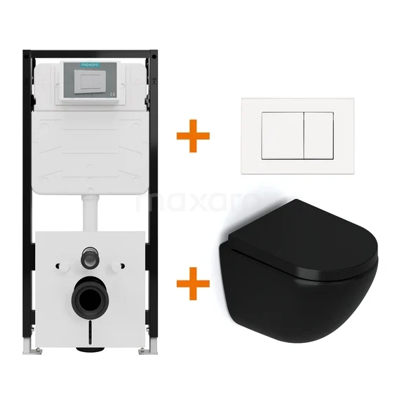 Toiletset Mat zwart zonder Spoelrand + Maxaro Flush Slim Pro inbouwreservoir met geluidsisolatie